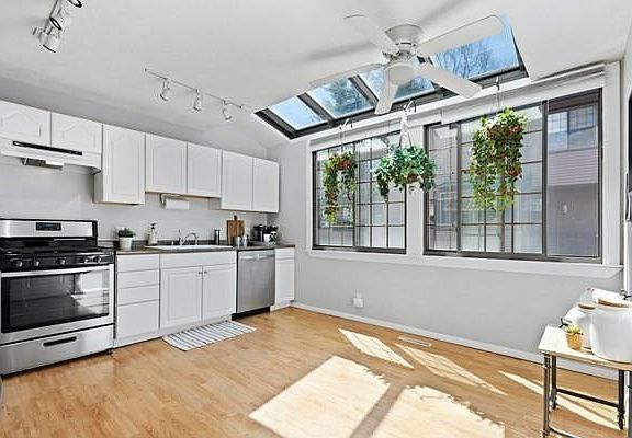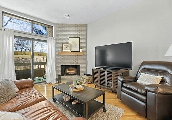 Welcome home to this modern and sunny townhome in desirable Chelmsford Village. High ceilings and hardwood floors compliment an open floor plan with sliders that open onto a private deck. Cozy up to a wood burning fireplace while enjoying the private views of the woods behind. The eat-in kitchen with picture window and new skylights and stainless steel appliances offers a large pantry. An updated half bath completes this floor. Upstairs are 2 generously sized bedrooms with vaulted ceilings and double closets, a full bathroom with double vanity, and a laundry area. The finished lower level offers a bonus room, perfect as a 3rd bedroom, office, or home gym. Central a/c, new carpets, 2 car garage, and fresh paint throughout. Enjoy all the amenities-tennis courts, swimming pools, clubhouse and walking trails, in a commuter friendly location with the convenience of shopping, schools, and restaurants nearby.