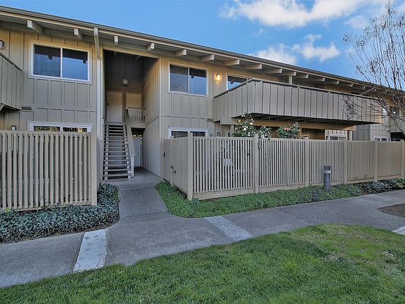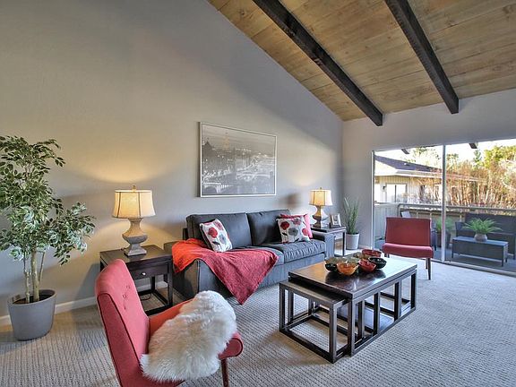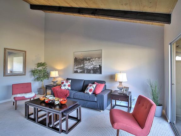 Rare top floor unit with soaring vaulted beamed ceilings and generously sized rooms! Ideally located in the middle of the complex behind the clubhouse. Dramatic living room with sliding door to deck. Updated kitchen with subway tile backsplash, granite countertop & new stainless steel dishwasher. Separate eating area with ceiling fan opens to large living room. Updated bathroom features glass vessel sink, granite countertop, separate tub & stall shower enclosure. Freshly painted throughout. Enjoy the large deck with views of the greenbelt. Complex features fitness center, 2 pools, sauna, clubhouse & car wash area. Three laundry facilities conveniently located near the unit. One-car covered parking with additional storage - carport & storage #29. Close to Rengstorff Park and Community Center with its pool, tennis courts, skate park, and exercise course. Minutes away from Downtown Mountain View. Easy commute to freeway & major tech companies. Schools - Castro, Graham & Los Altos High.