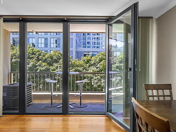 Spacious and bright mid-century modern condo in the Harrison West building, located in the heart of downtown Portland. This 4th-floor unit features floor-to-ceiling tilt-turn windows, a private balcony with treetop and city views, and air conditioning for year-round comfort.
