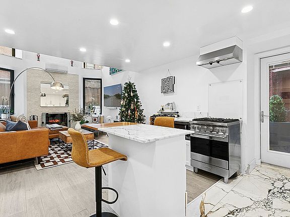 Walking into this home, you find yourself in the foyer featuring new hardwood floors, noticing crown molding on the top floor which adds an architectural polish. The newly renovated kitchen, is anchored by Calacatta marble countertops, and a suite of high-end appliances, including a new SMEG stove and hood, Sub-Zero refrigerator, and Miele dishwasher.