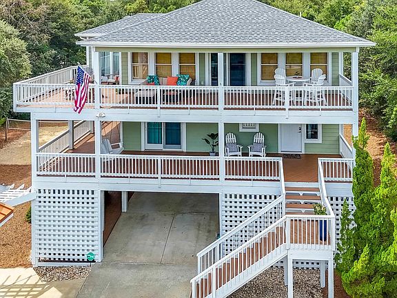 Excellent opportunity to own in the sought after Southern Shores community with this meticulously maintained move-in-ready fully furnished home perched on a partially wooded high dune homesite featuring 5 bedrooms, a detached 2-car garage with large (unfinished) loft, an oversized pool (33'x16'), over 1,500 sq. ft. of covered and sun decking, and more. The top level of this home features a remodeled custom kitchen, open and bright living and dining area, a sunroom, remodeled bathroom, a bedroom, and expansive decking with limited ocean views. The middle level of this home features a primary bedroom with full remodeled bathroom and two additional bedrooms with a shared full remodeled bath. The ground level includes a game room with pool table and a wetbar, a laundry area featuring Speed Queen washer and dryer, a full bathroom, and a fifth bedroom currently being used as a gym. Easy access to the private pool and hot tub area, dry entry, volleyball court, and landscaped yard. Storage room downstairs in the carport. With close proximity to the beach, the sound, and the town of Duck, this home would make a great primary home, second home or vacation rental.