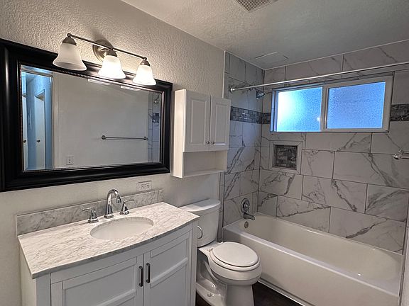Updated vanityTiled showerNew laminate flooringFresh paint
