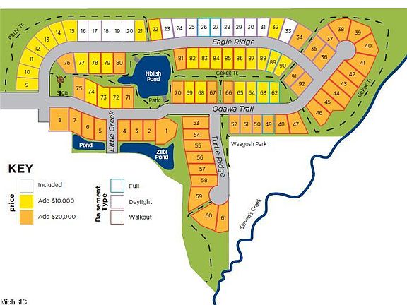 This 'Alder' ranch home plan is situated on lot #23 with a daylight basement and wooded back yard. The Alder offers 2 bedrooms and 2 full bathrooms. Convienient main floor laundry. This smart design uses space efficiently. The open concept great room offers access to the back deck. Spacious eat in kitchen with pantry. Master suite hosts a private bathroom and walk in closet. The daylight basement is plumbed for a full bathroom and could be finished for future living space. Odeno is a custom homedevelopment in Fruitport Schools. Winding roads, walking trails, and community ponds set this neighborhood apart. Private and serene, yet just minutes from highway access, shopping, and recreation. Choose your lot, home plan, and finishes. Welcome to Odeno- Place of Many Hearts.