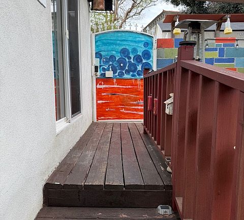 Newly remodeled back mini house (150 sq. ft.) with a private bath, small kitchen, private entrance, outdoor parking, mini foldable computer desk, full-size bed, and full furnishings.