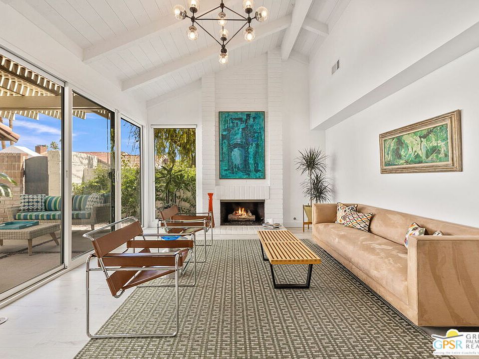 Wow! This Canyon Sands bungalow is pure South Palm Springs MAGIC! Dramatic architectural lines and designer finishes channel the pages of Dwell Magazine, while the living and dining areas are anchored by a bold fireplace that flows seamlessly to the remodeled kitchen and private courtyard where a gate opens to a path that is a short hop to the saltwater pool and spa. A custom bar with wine cooler enhances the dining room, and attention to detail shows throughout with custom cabinetry, quartz counters, fresh paint, striking wallpaper, and dual pane windows and sliders. Both bedrooms are ensuite with the primary suite offering a frosted glass shower wall as a sleek surprise and clerestory windows in the guest bath adding dramatic natural light. Outdoor living is enhanced by a new concrete patio and alumawood pergola. The attached two car garage with direct access includes storage, laundry, and a new tankless water heater, and importantly no walls in the living areas are shared with neighbors, only the garage. Canyon Sands spans 33 lushly landscaped acres with with tennis, pickleball, saunas, and seven sparkling pools and spas. Once home to Gene Autry's Melody Ranch hotel and now neighboring Parker Palm Springs, the neighborhood offers quick access to hiking and bike paths for a lifestyle like nowhere else!
