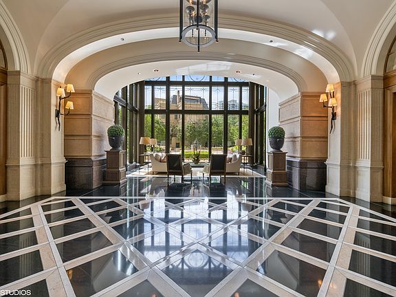 Exquisite in every custom detail, this stunning 4400 square foot residence lives like a single-family home. Featuring 12' ceilings, this home exudes elegance and warmth with a lighthearted touch. Every room reveals thoughtful design with obvious attention to even the smallest details including storage, air flow, lighting, custom millwork and built-ins. Soaring ceilings and huge floor-to-ceiling windows provide views of Lincoln Park, North Pond Nature Sanctuary, stunning sunrises and moody evening light. Four expansive terraces (over 1100 square feet total) offer unparalleled options for relaxing, dining, cooking/prepping, exercising and daydreaming. The spacious foyer leads to the sweeping living room and dining room with gorgeous views, meticulous finishes, and gas fireplace. Serving is a dream from the prep kitchen/butler's pantry adjacent to the dining room with a third dishwasher for glassware and wine storage. The impressive kitchen enjoys views of the park & lagoon as well, providing a home chef with a carefully conceived working and dining space that all can enjoy. Appliances are a dream with double Miele ovens, cooktop/hood, warming drawer, two dishwashers and Miele refrigerator. A delightful terrace adjoins the kitchen and is the ideal space for grilling and taking in the idyllic lagoon views. The family room is multi-functional with high gloss lacquered storage, serving as a space devoted to both relaxing and working, a testament to considered design. The primary bedroom suite features morning views of the park and pond, an office niche, huge custom designed closet, and a private balcony large enough for exercise and relaxation. The en suite bath offers treetop views and has an expansive quartzite vanity with black lacquer cabinetry and plentiful storage. The three additional bedrooms are spacious, bright, and all ensuite, serving as sanctuaries of their own. Each boasts hardwood floors, custom built in beds, seating & desks and en suite stone baths with heated towel bars and gorgeous walk in custom closets. Finishes throughout are truly extraordinary with everything chosen to create an elegant but approachable feel, outfitted with Philip Jeffries wall coverings, custom lighting and Holly Hunt furnishings. Last but certainly not least, is the well positioned laundry/mud room, conveniently located just off the service corridor and outfitted with custom stone, cabinetry and built-ins, more akin to a high end boutique than laundry facilities. This home is fully automated with the Control 4 system for sound, lighting and motorized shades. 2550 Lakeview is renowned for its talented and devoted staff and offers valet parking, resident's lounge, club room, library, movie theater and 1.25-acre park. Other amenities include a fitness center, indoor swimming pool, steam rooms and sauna, whirlpool, yoga room, in-house dry cleaning, sun deck and dog run. Four garage parking spaces and four storage units are included with this home. A truly elegant, yet functional sanctuary in an idyllic Lincoln Park location.