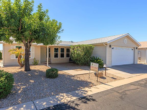 Upgrades GALORE in this 2 bed 2 bath home WITH 2 car garage, front covered patio, back covered PRIVATE patio plus all seasons AZ Room! Both bathrooms have custom tiled showers and updated vanities. The kitchen has all new stainless appliances, a large farm sink, RO and neutral counters and cabinets. This home has ZERO carpet and NEW WINDOWS in front! Don't miss out on this gem of a home, it has been well maintained with records kept! Call Today New Roof 2022 New Irrigation System Great Outdoor Spaces