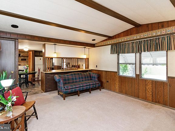 Awaiting a new owner!!!!! This 1981 Zimmer mobile home in Hillandale Homes Park is waiting for you. The living room has a cathedral ceiling with exposed beams for added architectural interest. The eat- in kitchen with pantry and space for table & chairs gives a separate dining feel; as well as there is a breakfast bar /counter area facing the living room that with room for stools if desired. The front bedroom features a large bay window allowing for natural light, electric wood stove, and an attached half bath. The back bedroom offers a 12x10 permitted addition with vaulted ceiling to allow for natural light to flow. There is a 3rd small bedroom, craft room or office, maybe? This home also offers a very large main bath with double sink, a separate vanity/makeup area and a new vinyl tile floor. The living room walls newly wallpaperedand the the kitchen and hallway have laminate flooring celings. Freshly painted ceiling in the Living room, kitchen, hallway and both bathrooms, as well as the walls in the kitchen and hallway. Enjoy your outside space under the large, covered deck surrounded by mature landscape. Outside features also include, 2 off street parking spaces in the asphalt driveway, 2 sheds for storage, a smaller back deck, small foot bridge, and 3 benches to relax. Please note ALL RESIDENTS must be approved by the Hillandale Homes property manager. The ground is $685 per month which includes, water, sewer, trash removal 2x a week and snow removal of the common areas.