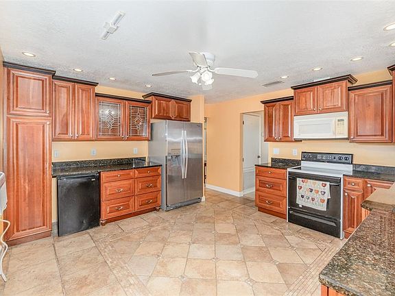 This home has some serious personality and endless potential! The custom kitchen is a standout, featuring solid wood cabinets with stained glass inlays and eye-catching tile work. Starting with a new roof that's only one year old, also featuring a wood burning fireplace. Step outside to an inviting front yard, a backyard pool with stunning views of Lake Brown, and direct access from the master bath to the outdoors. Vintage 1979 tile? Totally back in style. While the HVAC and garage door need some TLC (both are in need of replacement), there are 4 window units to keep things cool. HOA perks include a private lake with boat ramp, plus access to basketball and tennis courts. A true gem with character, charm, and a few fun projects for its next owner!