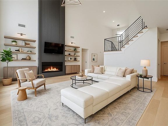 Modern finishesElectric fireplaceThree-car garageSleek architectural linesPrivate officeSpacious backyardMassive covered deck