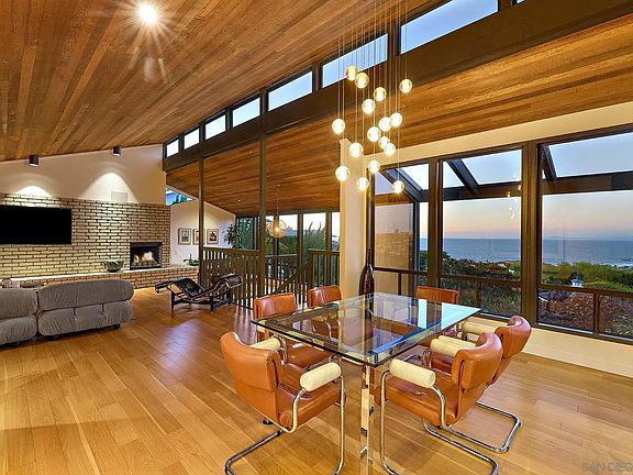 Perched above La Jolla Shores with sweeping 270-degree views, this striking architectural home celebrates form, light, and the beauty of its natural surroundings. Thoughtfully redesigned with a focus on modern livability, the residence balances mid-century inspiration with contemporary refinement. A reverse floor plan maximizes the breathtaking coastal panorama—from the distant mountains of East County to the shimmering Pacific Ocean. Walls of glass, exposed beams, and vaulted cedar ceilings flood the interiors with warmth and light, blurring the boundaries between indoors and out. The reimagined kitchen offers a refined minimalist aesthetic with flat-panel European-style cabinetry, open shelving, and sleek quartz countertops—perfectly aligned with the home’s architectural vision. Each bathroom has been artfully renewed with a serene, spa-like design that emphasizes natural textures and clean lines. An inviting gated courtyard sets the tone for what lies within, opening to a dramatic glass pivot entry and open-riser staircase that frames ocean views beyond. Modern updates include a new standing seam metal roof (2024), epoxy-coated garage floors, a newer HVAC system (2023), and owned solar—ensuring both comfort and sustainability. Set on a secluded .51-acre lot, the grounds are a living work of art—lushly landscaped with sculptural plantings, mature pines, and layered greenery that provide total privacy. The pool and surrounding gardens create an intimate outdoor retreat just moments from La Jolla Shores Beach, world-class dining, and the village. A rare harmony of architecture, landscape, and light—**2551 Via Viesta** is a private coastal sanctuary that captures the essence of La Jolla living.