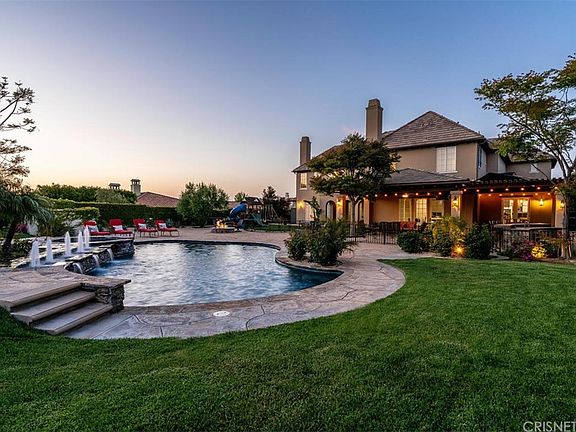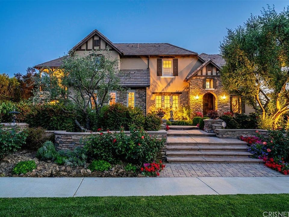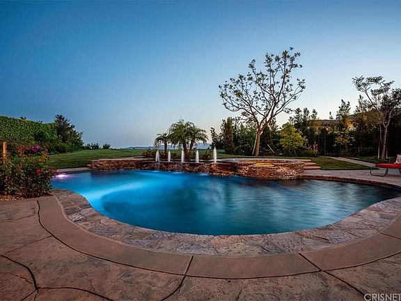 Introducing this stylish and elegant modern European country styled home in the prestigious guard-gated community, The Oaks of Calabasas. This 6,745 (per assr) sq ft estate on a huge 28,517 (per assr) sq ft lot with breathtaking views boasts an abundance of charm, warmth and elegance. As one enters into this exquisite home you'll enter a grand foyer that leads to the dramatic living room highlighted by a stunning chandelier and fireplace and adjacent to the formal dining room, both open to a central courtyard also with fireplace, offering tremendous opportunity for family living and entertainment. Featuring 5 bedrooms and 7 baths, travertine and wood flooring, a chef's kitchen with large center island open to the family room with fireplace, a bonus room perfect for a home theater and a designated office. There is 1 bedroom down with a spectacular wood staircase leading to 3 additional ensuite bedrooms, which surround an upstairs family room. There is also a craft / study room and a light filled hallway that leads to the romantic master bedroom, which has a sitting room, fireplace, 2 gorgeous bathrooms, a large shower and spa tub, 2 closets with built-ins and a balcony. Lastly, a series of French doors lead out to the rear terrace with covered patio, BBQ area, firepit, a spectacular pool and spa with large Baja shelf and water features for the ultimate outdoor living experience. There is also an abundant grass area and incredible views, all in a very private and serene setting