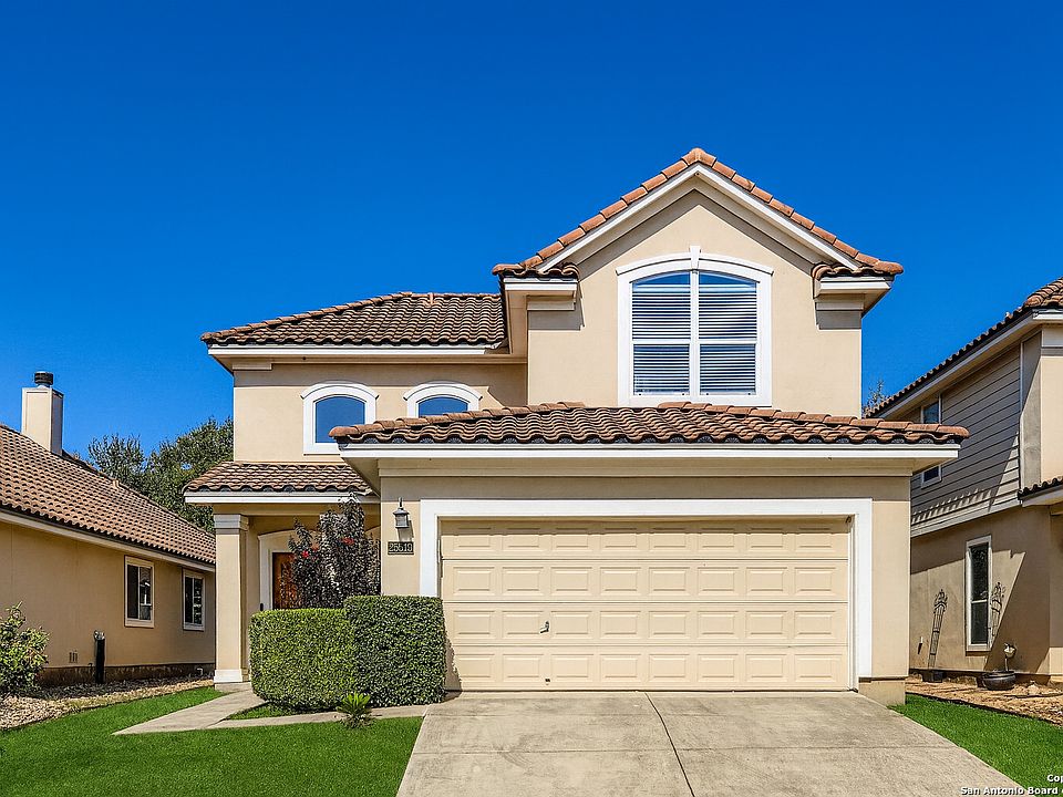 Perfect for busy professionals, golf lovers, or anyone seeking a low-maintenance lifestyle, this elegant 3-bedroom, 2.5-bath home sits in the gated Villas at Canyon Springs. The Spanish Mediterranean exterior features a tile roof, stucco, and fiber cement siding, while inside, an open floor plan offers effortless entertaining and everyday comfort. The chef's kitchen boasts a large island, stainless steel appliances, stylish backsplash, and abundant counter space, complemented by a reverse osmosis water system for fresh, clean drinking water. Upstairs, spacious bedrooms include a serene primary suite retreat. Thoughtful updates include recently replaced carpet with upgraded padding, custom window blinds with a lifetime warranty, stylish hardware throughout, and a recently updated interior HVAC unit. The garage features epoxy-coated flooring for a polished, durable finish. Enjoy resort-style amenities including a pool, jogging trails, playground, and sports courts. Ideally located near Canyon Springs Golf Club with easy access to Stone Oak dining, shopping, and top Comal ISD schools, this home offers a move-in-ready experience and the convenience of a true lock-and-leave lifestyle.
