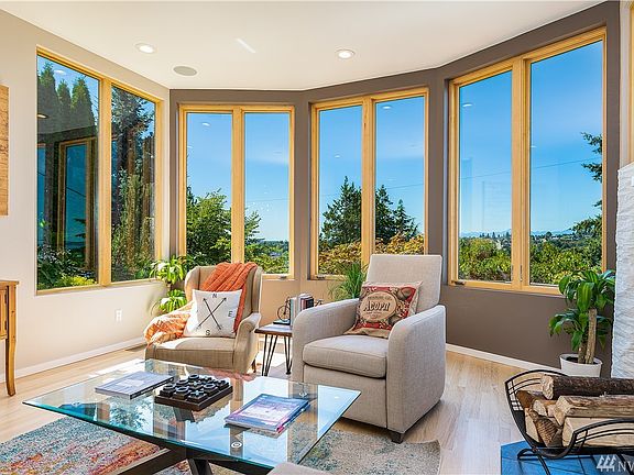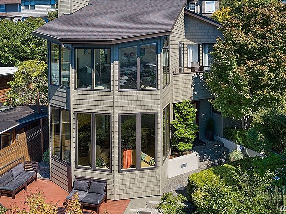 The West QA lifestyle beckons from this NW Contemporary private garden oasis! Soaring ceilings & huge windows overlook Puget Sound and Salmon Bay. Gracious main floor living, formal dining, remodeled eat-in kitchen w/wet bar & Subzero/Miele appliances. Guest bed & bath on main. Upstairs features huge rec rm, master suite, 3rd bed/bath & office/potential 4th bed. Enjoy summer w/friends outdoors on view decks, or inside w/central AC. Walk to Coe Elementary & Macrina Bakery. Exceptional!