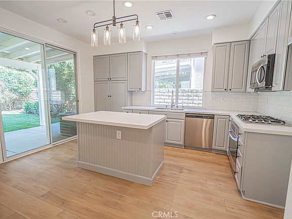 Welcome to Stevenson Ranch! This 4-bedroom, 3-bath home spans 1,903 sq. f.t and blends thoughtful updates with everyday functionality. Step inside to find luxury vinyl flooring throughout, a light and bright open floor plan, and a beautifully remodeled kitchen featuring stainless steel appliances, quartz countertops, an oversized island, and a custom tile backsplash. The dining room is elevated with classic wainscoting, while the upstairs loft offers flexible space for a home office or additional bedroom. All bedrooms, the loft, and the den include brand-new ceiling fans with remotes, mirrored closet doors, and updated recessed, can less LED lighting that allows you to adjust the color temperature throughout the home. The upstairs hallway bath has been updated and features a separate shower and commode for added privacy and convenience. Outside, enjoy a spacious backyard with a covered patio—perfect for gatherings or quiet evenings. Located in a highly sought-after school district and just seconds from the freeway, shops, and restaurants, this home checks all the boxes for comfort, style, and convenience.