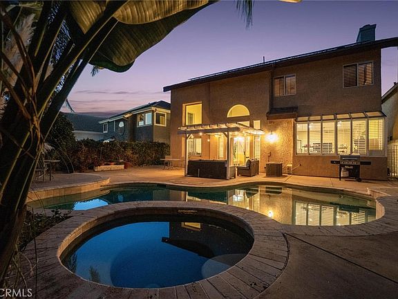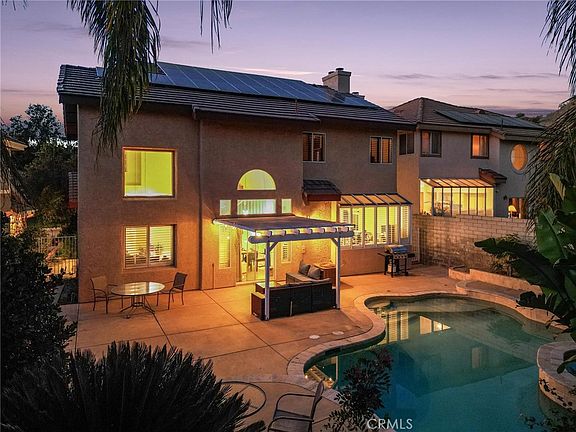 Stevenson Ranch pool home with a great cul-de-sac location on the view side of the street. Truly an exceptional spot for those desiring all the features of Stevenson Ranch in a 4 bedroom pool home with OWNED solar to power it all! Soaring ceilings upon entry reflect the open floorplan with a full bedroom and bath downstairs and 3 upstairs. 3 of the 4 bedrooms are oversized with the primary being especially spacious and featuring a second fireplace. Good-sized walk-in closet too. The kitchen was redone in granite and Corian, stainless appliances, tile backsplash and it opens into an oversized family room. Really a nice flow to the floorplan. 2-car garage with cabinets. The yard is private with shade bar and large patio, and you can see all the hills in the distance, so the setting is special. The solar system is owned, there are NO Mello Roos taxes, low HOA and close distance to shopping, restaurants, schools and the freeway make this a winner!