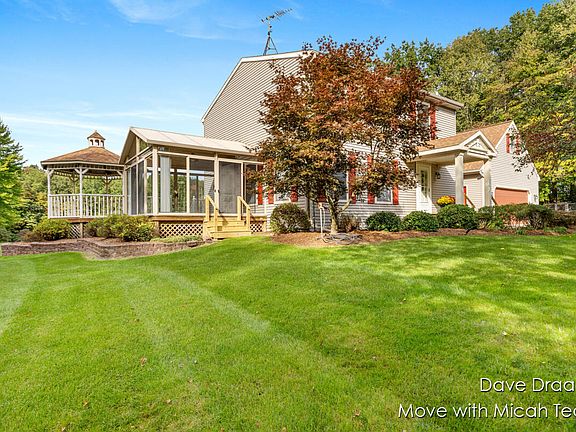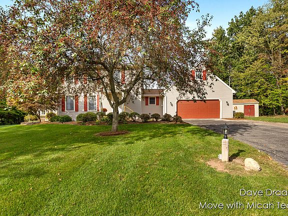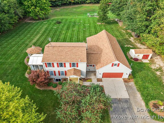 *Open House Cancelled* Nestled on 5 picturesque acres, this beautifully maintained home perfectly blends comfort, space, and natural beauty. The short winding drive sets a peaceful tone as you arrive. With over 3,500 finished sq ft, this spacious home features 4 bedrooms and 3 full baths. Step inside to an inviting living room that flows to the dining and kitchen area. The kitchen offers generous counter space, abundant storage, and an island for gathering. Just off the dining room, enjoy a charming three-season room with views of vibrant fall colors. Back on the main floor is an expansive yet cozy primary suite with a walk-in closet and private access to a full bath. A large entryway, laundry, and a second full bath complete this level. Upstairs is 3 more bedrooms and a full bath. The finished lower level offers a spacious living area. Outside, enjoy open green spaces, a wooded backdrop, and even room to start your own hobby farm—all just 30 minutes from GR!