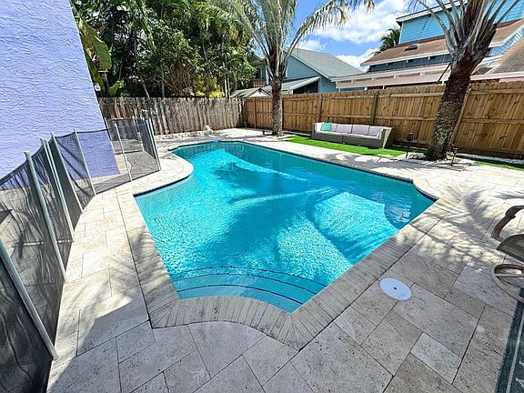 Beautifully updated 3-bedroom, 3-bathroom single-family pool home with no association, conveniently located near major transportation, beach, and downtown Delray. This spacious home features vaulted ceilings, open loft with spiral staircase, and a modern kitchen with stainless steel appliances. The split-bedroom layout offers generously sized rooms, updated bathrooms, and walk-in closets. Enjoy private fenced in backyard oasis with gated pool and travertine deck. Additional highlights include a one-car garage with washer and dryer, plus a large driveway. Rent includes pool and landscape service. Application and screening required. Pet okay with an additional fee. First month's rent, last month's rent, and a security deposit are due upon move-in.