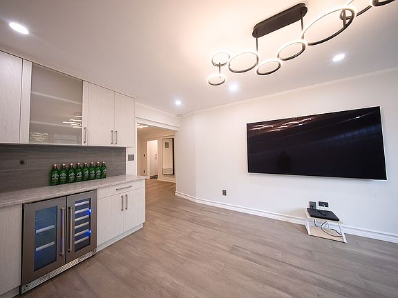 Living room adds a built-in bar with beverage center, wall-to-ceiling cabinetry with bench, and an 85"