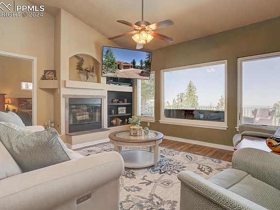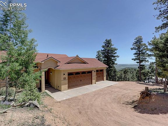 Welcome home to your mountain retreat! Enjoy breathtaking views of Spruce Mountain Open Space, Greenland Open Space, and downtown Denver. Amazing south facing ranch home with finished walkout on 4 acres with 4 bedrooms, 3 bathrooms, home office, and an oversized 3 car garage. You will love vaulted main level with 2 bedrooms and 2 bathrooms, a great room with amazing views and 2-sided fireplace, kitchen with updated custom island, quartz counters, stainless appliances, and pantry with a barn door. The dining area has a slider to the deck for outdoor dining and entertainment. The primary bedroom has an ensuite bathroom, there is a slider in the primary suite so you can access the new concrete deck so you can enjoy incredible sunrises and sunsets. New Renewal by Anderson windows on the main level - high elevation R-value, invisible screens, lifetime warranty. The basement has 10' ceilings and views. There is a large family room, wet bar, wood stove, office with French doors, 2 bedrooms, and a full bathroom. New exterior paint. The lot has beautiful, tall pines but there is a large, flat area with plenty of room to park your RV and toys. Woodmoor Mountain is a private, gated community. Work from home with high speed internet! Located just minutes from Palmer Lake and Monument, and midway between Denver and Colorado Springs!