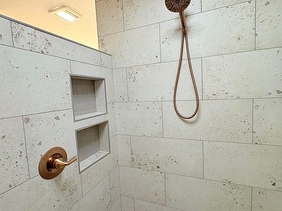 Natural pondPartially covered deckBreakfast nookQuartz countersWhite kitchen cabinetryTile backsplash