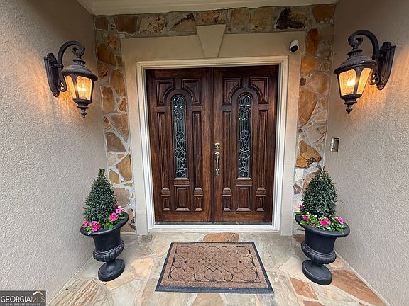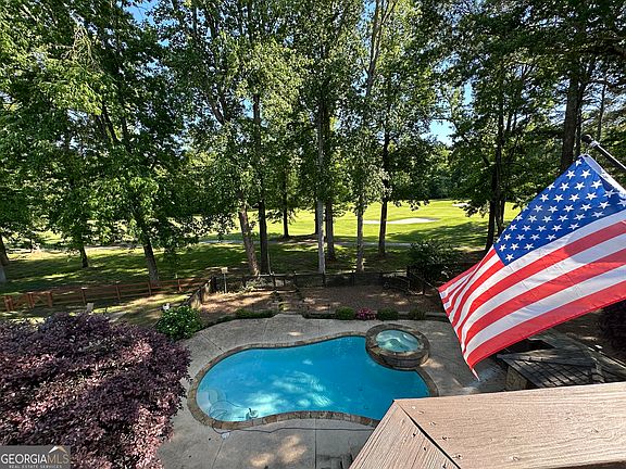 There is nothing ordinary about this meticulously maintained 6 bed, 4.5 bath primary-on-main home located in the highly sought-after Riverlinks section of Horseshoe Bend, on Village on the Green. Located at 2555 The Fifth Fairway this Mediterranean-style home is a 5,100-square-foot property on a rare golf course and river lot, with a private pool. This three-level home features an open floor plan with light-filled spaces. The main level has hardwood floors throughout. The master on main suite includes two walk-in closets, a bathroom with an open shower, jacuzzi tub, and granite countertops, plus river and golf course views. It opens to the rear deck. Upstairs, three bedrooms each access granite-appointed bathrooms. The finished daylight terrace level, opening to the pool deck, includes two more bedrooms, a full granite bath, a great room, and a theater room. With six bedrooms and 4.5 baths total, the floor plan offers space for living, hosting, and relaxation. The gourmet kitchen with double pantry was updated in May 2025 with the dining room, flows into the great room and deck, with Chattahoochee River and Horseshoe Bend golf course views. Extensive crown molding and plantation shutters are installed throughout. Upgrades include new skylights (2024), new roof (2023), 6" gutters with leaf guards (2023), repainted exterior (2024), windows/doors (2022-2024), garage door and resurfaced floor (2024), one of three HVAC units new (2025), twin 40-gallon water heaters (2023), and a transferable home warranty. Outside, the fenced backyard includes a 22,000-gallon in-ground Gunite pool (resurfaced 2023, new sand filter 2021 with recent sand replacement), stacked stone hot tub, and pool deck. Situated on a cul-de-sac, the property is in the desirable Horseshoe Bend community, which offers amenities such as the clubhouse, tennis, swimming, pickleball, and golf. This home is ready for your personal customizations and final special touches.