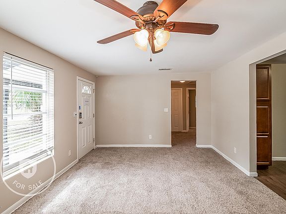 This Jacksonville one-story home offers an eat-in kitchen, bathroom corian countertops, ceiling fans, and a covered patio.