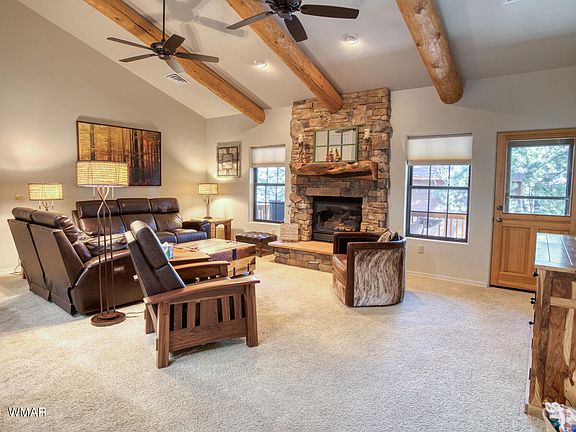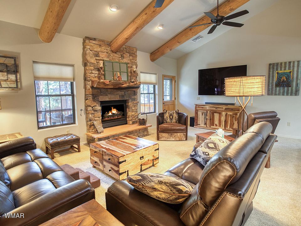 Gorgeous! This stunning upstairs end unit features vaulted ceilings with authentic rustic log beams and a stacked stone fireplace. Inside, you'll find a tastefully updated kitchen equipped with upgraded appliances, new granite countertops, new flooring, and modern fixtures. The bathrooms have been beautifully remodeled with custom tile and shower enclosures, granite countertops, new mirrors, and fixtures. The spacious primary closet has been enhanced with a custom closet system. The interior boasts fresh paint, upgraded fixtures, and custom ''top-down bottom-up'' blinds throughout. This condo is perfect for your home or getaway—truly a must-see!