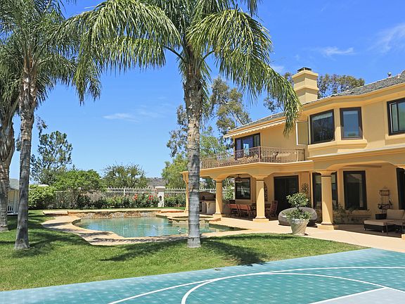 Located at the very end of the cul-de-sac and up a long driveway rests this beautiful view home. You are greeted with custom iron & glass entry doors, travertine & hardwood floors, faux paint, three fireplaces, custom iron stair rails, crown moldings and bay windows. Features include five bedrooms, plus a dedicated office, and family room highlighted by Fleetwood sliding doors that fully open across the whole room for true indoor/outdoor living. The gourmet kitchen boasts granite center island & stainless steel appliances. The master suite has an oversized walk-in closet, granite counters in the bath, spa tub and full sized walk out balcony, showcasing the sunset and mountain views. The grounds include a Pebble Tec pool & spa, basketball court, grassy lawns, rose gardens, fountains, and pastoral views, all with complete privacy.