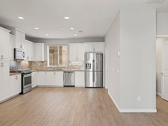 Located in the newer Citron community in the heart of Escondido, this 3 bedroom, 3.5 bath home offers 1,408 sqft. of modern living space with gorgeous wood-look ceramic tile, high ceilings and a flowing floor plan that's perfect for entertaining or simply enjoying day-to-day life. The large great room is accented with an over-sized ceiling fan adding both style and comfort. The kitchen is outfitted with stainless steel appliances and enhanced by upgraded backsplashes. Storage won't be an issue in this turnkey home as it boasts ample cabinet space throughout. This property comes with a fully finished two-car garage and tankless water heater for added efficiency. Additionally, top to bottom Sky View Levelor window coverings are installed throughout the house offering privacy while letting natural light filter in. Within your new community, you'll find an adorable tot lot and dog park - ideal for entertaining all the members of your family. Trader Joe's along with other shopping outlets are conveniently close by in addition to a fitness center that is within easy reach promoting an active lifestyle. The location also affords great freeway access making commutes easier whether you're heading into downtown San Diego or venturing further out.