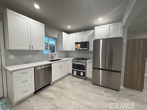 Stylish quartz-countertop kitchenElegant tile flooringBrand-new stainless-steel appliances