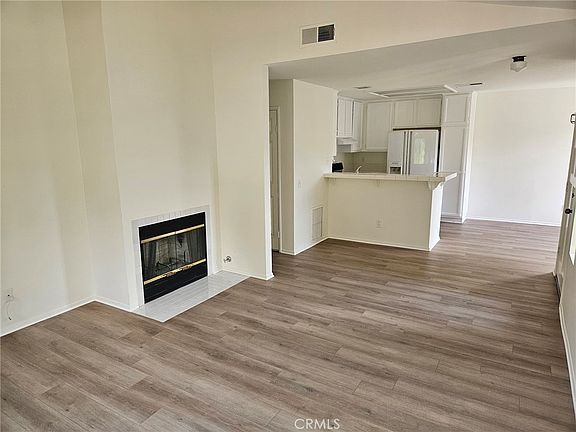 Serrano Sand Castle is this well maintained 2 bedroom 1 3/4 bathroom upper level end unit. Living room is light & bright, with a cathedral ceiling and a view of the green hillside through the windows. A breakfast bar separates the living room from the kitchen and adjoining dining area. The living space features new luxury vinyl flooring, central air conditioning, central heat, a living room fireplace with gas starter, a laundry closet with stackable washer / dryer included. The primary suite boasts new carpet, a wall of closets with custom organizational system, a full bathroom and a sliding glass door that opens to a small balcony with additional storage. Serrano Sand Castle offers its residents a hot tub area with bathrooms and a tot lot, a perfect spot for some outdoor relaxation. The surrounding community offers shopping centers, restaurants, premium sports fields, and is not far from the Irvine Spectrum and the Great Park.