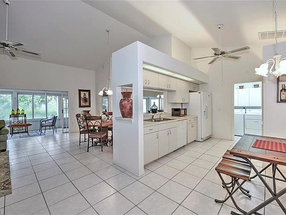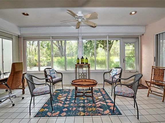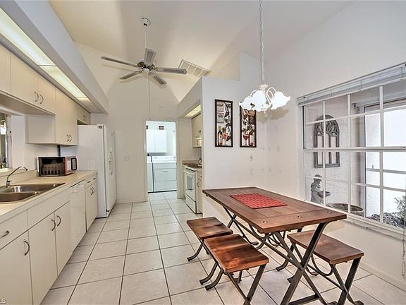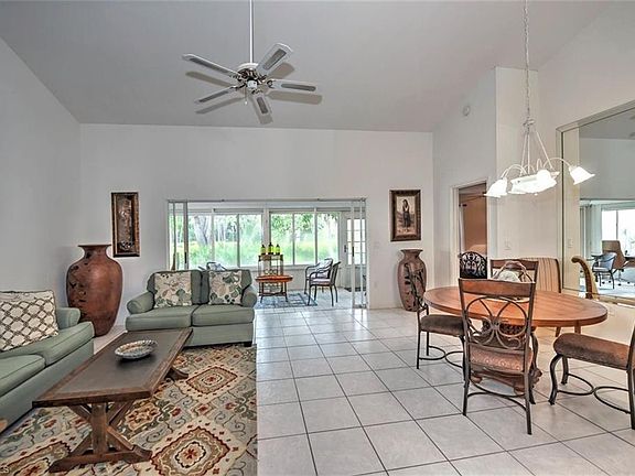 With over 1,300 square feet, this 2 Bedroom 2 Bath, 1 Car garage home feels like a Single Family without all the exterior yard up keep. Enjoy vaulted ceilings, a custom mirrored wall in the dining area and ceramic tile flooring throughout. Electric/rolldown HURRICANE shutters on all openings. New AC 2017. The kitchen features a breakfast nook, breakfast bar and formal dining area. The spacious Master Suite features a bathroom with double vanity sinks and a large walk-in shower. Relax on the large lanai with pocket doors that create a large opening to the living room; perfect for entertaining friends and family. Located on a private cul-de-sac within the community. The amenities at Fairway Dunes community include: Swimming Pool, Community Room and Tennis Courts. Just a short drive to some of Florida's best beaches (Barefoot Beach rated #2 in the USA!) and only minutes away from Coconut Point Mall and Mercato. NO FLOOD ZONE. Low HOA fee of $245 per month includes all the amenities, lawncare and irrigation water, outside building painting.