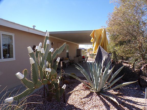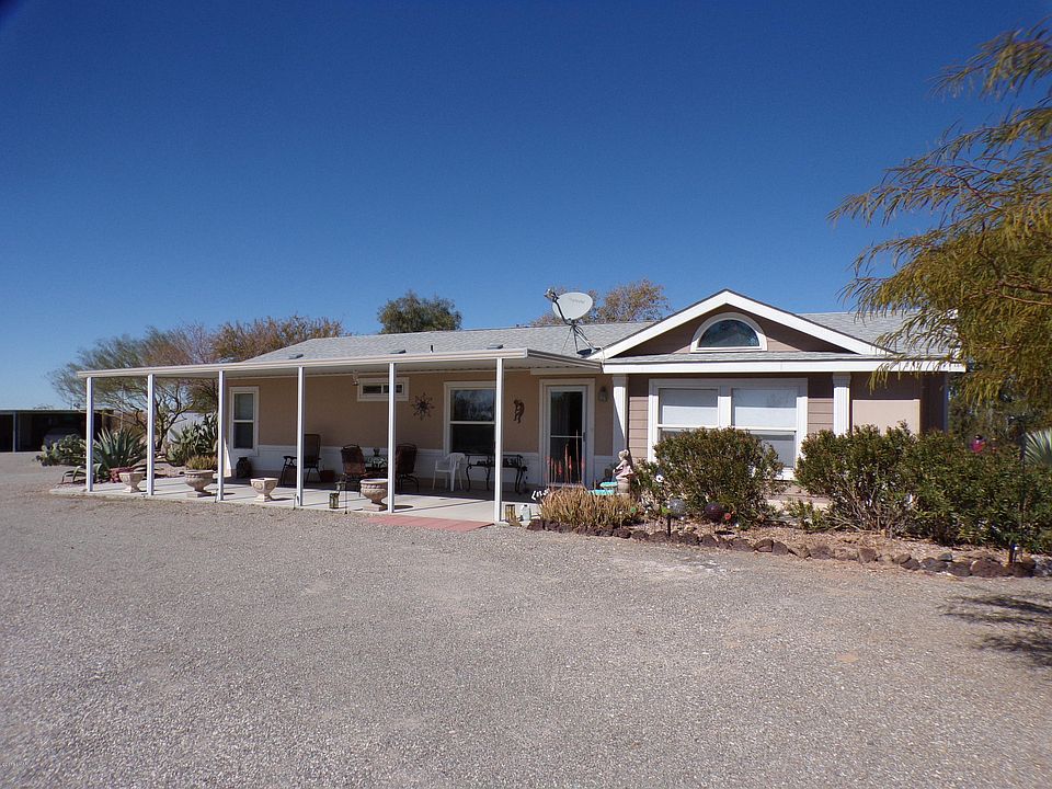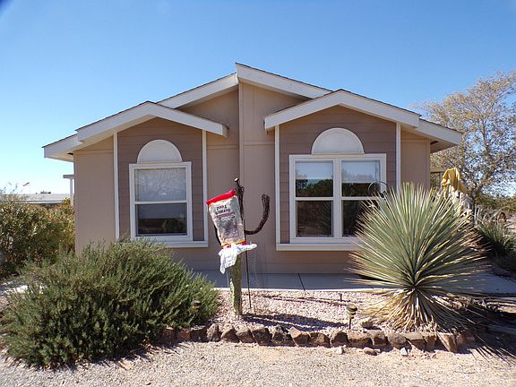 Brandy Hills,1 acre, beautiful 2 bed 2 bath home. RV hookup. Home contains vaulted ceilings, large kitchen,refer,stove included. Roomy dining area. Living room has dormer window, other windows provide plenty of natural light. Storm door on front entry way. Bedrooms are nice size. Masterbedroom has 2 closets nice for additional storage. Master bath has dual sinks, plenty of cabinets & closets for storage. the landryroom has storage and shelving& will include washer & dryer in sale. Large front and back covered 12 x 30 metal awnings on both porches Large 5 ton AC/heat unit to keep home comfy. . Concrete skirt surrounds home for easy mobility . A 40 x 22 4 car carport to park vehicles, with 10x40 container/workshop has 110 and 220 electric..Additional 7 x 20 container for storage/workshop also has electric. Home is surrounded by mature trees and plants, very nice desert landscaping all on auto water system. Very nice, look today.