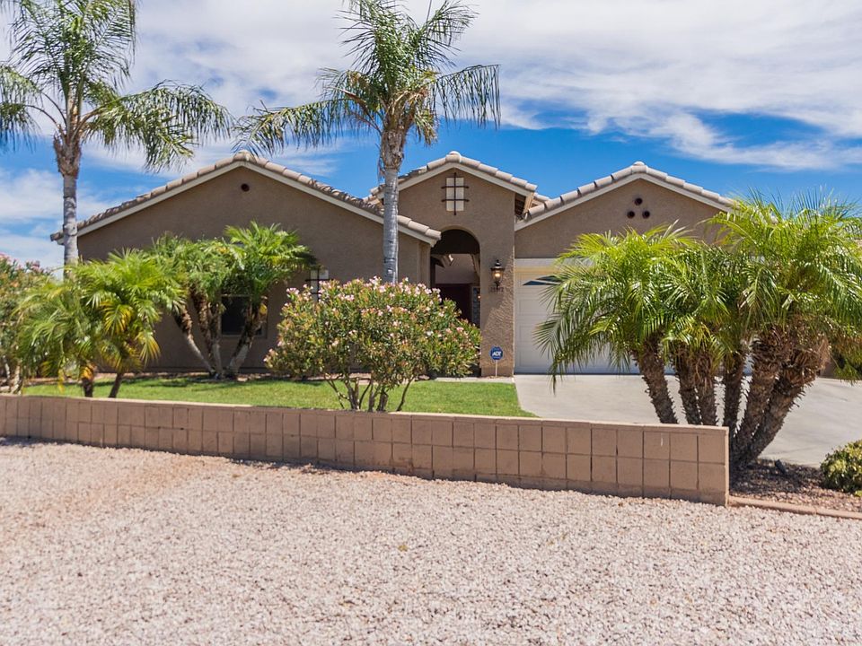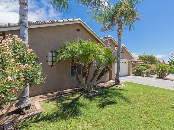 Come see this gorgeous 2,528 sq ft Canterra built home in the desirable Community of Westpark. This home offers 4 generous size bedrooms and 2.5 baths, ample closets, dramatic soaring ceilings, welcoming palette, plush carpet, ceiling fans, window blinds, & formal living/dining room. Family room with fireplace, large windows, media alcove, office & patio access from breakfast area. Center kitchen island, granite counters, breakfast bar, pantry, plant shelves, & plenty of handsome wood cabinets. Grand master retreat boasts a private en suite & walk-in closet. Front and back lush green landscaping with meticulous desert plants and accent lighting; perfect home for entertaining with covered patio and dining patio. Community Playground. Do not miss this desert gem! A MUST SEE!