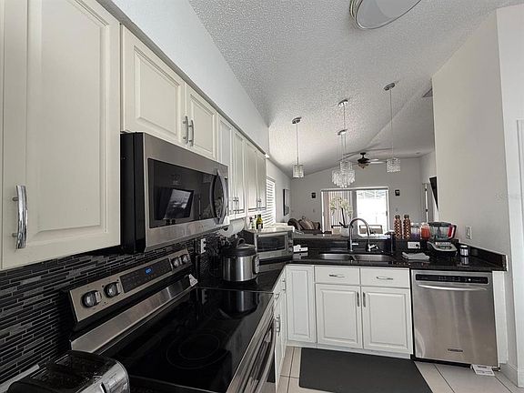 One or more photo(s) has been virtually staged. Location, Location, Location. One of the most desirable community with low HOA fees in kissimmee Florida .Welcome to this immaculate beautiful must see property, if you like to pay attention to details look no further this 3 bedroom and 2 full baths lead you into the open concept living and split bedrooms well maintained and remodeled with great touch. The kitchen has 2015 appliances refrigerator stove microwave and dishwasher has granite counter tops and a bar . The master full bathroom fully renovated with the latest best quality materials and design .Ceramic tiles throughout the entire house with sliding doors leading to the resurfacing pool with screened enclosure has child safety fence round the pool with great vinyl property fence for privacy with a french design Travertine tiles throughout the entire backyard a shed for your tools or can be a tiny house for your dogs .The entire exterior freshly painted a month ago the property has 2 car garage with great quality solid hurricane proof garage door with 2 remotes control also has 2018 AC unit 2023 water heater and laundry area washer /dryer included. Mature landscape with design 2 trees and 1 palm tree in front lawn .Security system installed with total of 4 cameras and 6 sensors throughout the property visual and audio 24 hours . ( This property can be short term long term rental Airbnb or primary resident ).