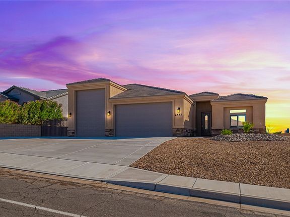 Looking for a spectacular RV GARAGE home with SIDE PARKING & PANORAMIC VIEWS? Look no further than this beautiful 1776 sf 3 bed 2 bath home located in the most sought after non-HOA community in the heart of Bullhead City, AZ. This home sits on a spacious .21-acre lot with breathtaking views of the surrounding mountain ranges, desert sunsets, & the Laughlin casino lights. This 2015 build has all the upgraded features throughout the home & more. The curb appeal to this home is 2nd to none with its easy to maintain desert landscape, stacked stone wainscoting, & huge area of paved parking space. Step through the leaded glass front door & be greeted by the grand foyer with 20" tiled floors & 5" base. That will lead you into the open concept / split floor plan designed home & the home's spacious living room area & adjoining kitchen. You have plenty of windows in this home to let in all that natural light, ceiling fans in every room, & elegant plantation shutters throughout. The kitchen is ready for that family chef with its breakfast bar island, granite counters, stainless appliances, pantry, & plenty of cabinets. The primary suite is tasteful with its plush carpet, private slider to the backyard patio, & a walk in style closet. The primary bathroom features dual granite top vanities, garden style soaker tub, & walk in tiled shower. The 2 guest rooms are also spacious in size & are located on the opposite side of the home from the primary for added privacy. The guest bathroom offers that same great granite counters & tiled tub/shower combo. An in-house laundry room with folding area & cabinets round out the interior features of this home. Need room for your RV, travel trailer, or your desert & water toys? The climate controlled 40' deep RV style garage + 2 car garage with 9' & 14' doors has you covered. There is even a 38' deep paved side yard area for added storage. Take the party outside into your private backyard space where you will find a full length covered patio, above ground metal style pool, elevated deck, & panoramic mountain, sunset, casino lights, & river views from every angle. Located minutes to the Colorado River, Lake Mohave, restaurants, & fun, this is the perfect full-time residence, part time vacation home, or cash flowing investment property all rolled into 1. Check it out today as you will not be disappointed.