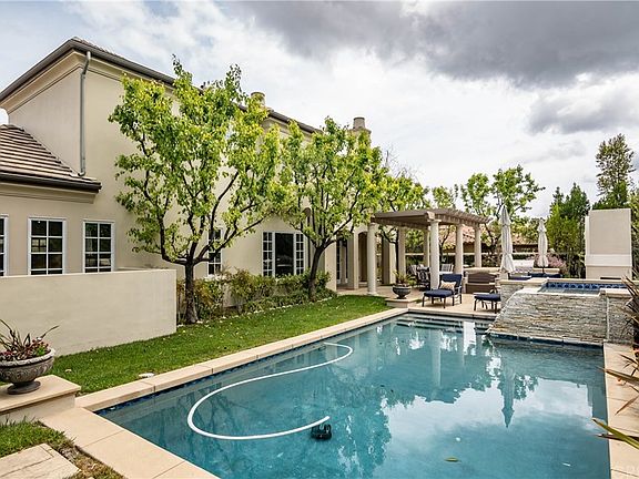 Beautiful French Country Estate located in the prestigious, guard-gated community of The Oaks. The spacious floor plan features over 5,100 square feet of living space. This beautiful home has five en-suite bedrooms including the spacious master with fireplace, separate retreat, dual closets, and French doors that open to the viewing deck/ balcony. The gourmet, center island kitchen features granite counters and stainless steel appliances; and opens to the spacious family room with fireplace. Additional features include a formal living & dining room with adjoining wine closet, separate office, and a large upstairs open loft/playroom. The stunning entertainer's backyard includes a sparkling pool & spa with waterfall, barbecue center, outdoor dining area and cozy fireplace. Additional amenities include hardwood floors, custom window treatments, and a 3-car garage with private motor court that offers parking for additional cars. Conveniently located just a short distance from the community center, this home is in the Las Virgenes School District and near The Commons shopping center.