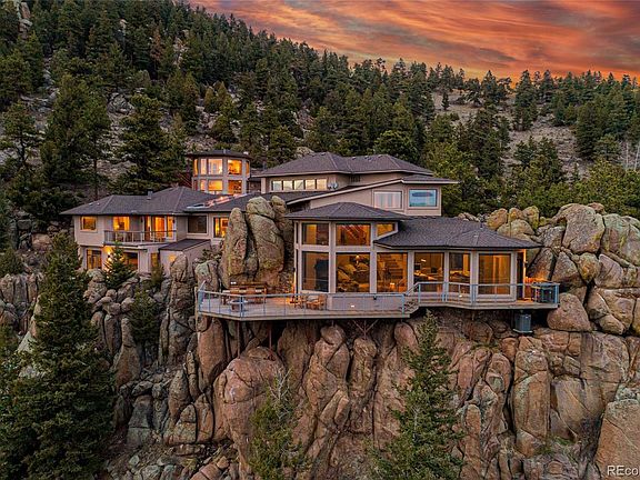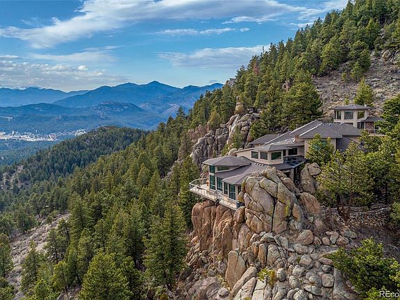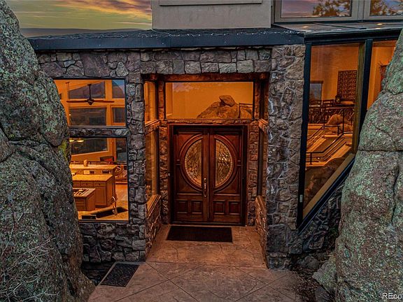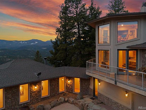 Views abound in this gated, uniquely designed home situated in a beautiful, natural setting of rock outcroppings with spectacular views of Evergreen and the snow capped mountains. Exposed beams, walls of windows and skylights bring the outdoors indoors. The grand front entrance opens to a water feature complete with a waterfall built into natural rocks. The home is designed to entertain and to accommodate all of your friends and family while also offering privacy to all. Since the main level living is built around boulders and a waterfall, you'll enjoy subtle water sounds while relaxing, entertaining or preparing dinner. A spacious primary bedroom with a private deck and 2 additional bedrooms with ensuite baths are also located on the main level. The upper level has 3 bedrooms and 2 baths. The lower level features a workout room, a theater room with tiered seating, a sunroom with hot tub, bathroom with a steam shower, a game room, and a bar complete with a dishwasher, refrigerator and sink. Heated attached garages and additional parking spaces will give you and your guests plenty of room to park. The private suite above one of the attached garages is equipped with a kitchenette, bath, deck, fireplace, a bedroom and a bonus room (currently used as a sleeping area). Sonos sound system throughout the entire home with multiple built-in ipads. Only minutes to downtown Evergreen and an easy commute to Denver or to the mountains for hiking or skiing. This house was winner of multiple design awards and named in the top 10 large houses for all of VRBO.
