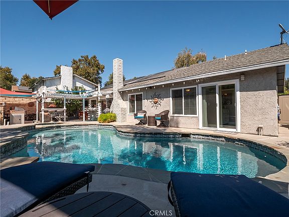 Welcome to 25583 Old Course Way, a highly desired single-story pool home situated on a picturesque cul-de-sac in the heart of Valencia! This charming and bright 3-bedroom, 2-bathroom residence offers 1,442 square feet of thoughtfully designed living space and sits on a spacious 5,986 square foot lot. A neutral palette, high ceilings, and an abundance of natural light create a welcoming atmosphere as you step into the foyer that flows into a large family room featuring a cozy wood-burning fireplace. The expansive eat-in kitchen is a chef’s delight, complete with stainless steel appliances, granite tile countertops, and a large window overlooking the serene, low-maintenance backyard. Ideal for indoor-outdoor living, the home boasts direct access to the backyard from both the family room and the versatile dining area, which can also serve as a secondary family room, game space, or home office. Outside, enjoy the recently remodeled pool and hot tub, a relaxing patio with a TV, and lush greenery—all perfect for entertaining or unwinding. The backyard also features a private dog run and a large storage shed, while the attached garage is a true craftsman’s dream with custom cabinets and a workbench. The primary bedroom offers convenient access to the pool area, making it easy to enjoy the outdoor oasis from the comfort of your own room. Additional upgrades include engineered hardwood flooring, a new garage door, a water heater, and a newer side gate. Located just steps from the Valencia trail system, this home offers quick access to shopping, dining, top-rated schools, and parks—perfect for enjoying the vibrant Valencia lifestyle. Plus, with no Mello Roos or HOA, this move-in-ready home is a rare find!