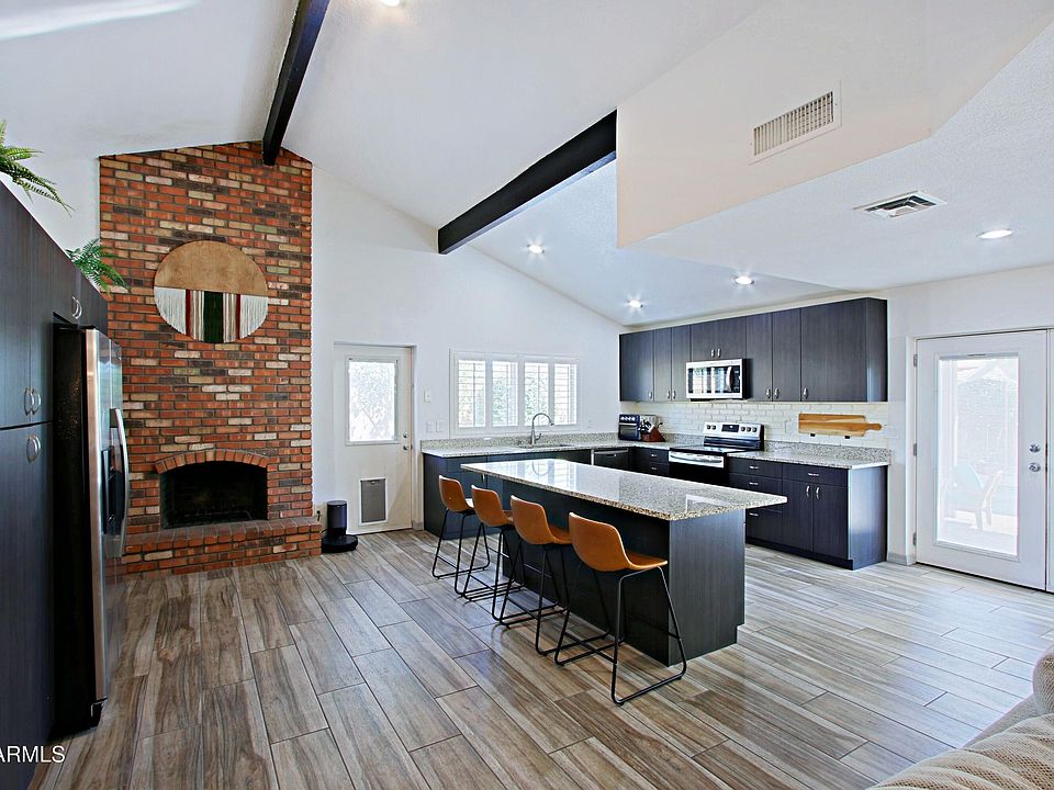 Step inside to this beautiful open Great room floorplan with lots of natural light and vaulted ceiling, all on a cul-de-sac with no HOA. Large kitchen features lots of cabinets, large island, granite counters, stainless steel appliances, new microwave, dual sink, fireplace, ext door to side yard, and cabinet pantry. Entertainer's back yard features sparkling pebble-tech pool, large grassy area, fruit trees&bushes, covered patio with TV, and RV gate w/plenty of room to put your toys. Primary bedroom has wood floors, walk-in closet, travertine shower, and double doors to back yard. Other features inc 3 yr old washer & dryer inside laundry rm, ceiling fans throughout, extra storage area in garage, plantation shutters, Nest thermostat, Ring doorbell/4 cameras/inside sensors & security system Pool vacuum and pool cover stay with property. Close to park w/playground, 101 freeway, dining, shopping & Tempe Market Place.