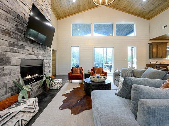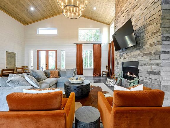 The open-concept interior features soaring ceilings, a grand stone fireplace, and a fully stocked gourmet kitchen designed for large-group cooking and dining. Huge windows let in natural light and forest views, blending luxury with the beauty of the outdoors.