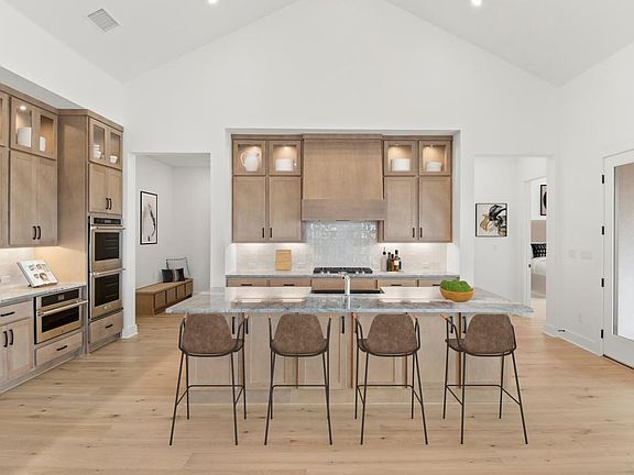 The Treaty Oak Hill Country is a single-story home with an elegant stone and stucco exterior. The elongated foyer is enhanced with a decorative tray ceiling and views into the great room. A short hall leads to three spacious bedrooms, two with a Jack and Jill bath and one with a private bath, all with walk-in closets. The private office has a double-door entry and views to the covered porch in front. The centrally-located media room is the perfect place for entertaining. The great room boasts a gorgeous cathedral ceiling along with a modern fireplace and multi-slide doors that open to the expanded patio. The casual dining area connects the great room with the kitchen that features a center island, convenient workspace, upgraded cabinets, and generous walk-in pantry. End your day in the primary bedroom that includes a luxe primary bath with the relaxing soaking tub as the focal point, two walk-in closets, walk-in linen closet, shower, drying area, bench, and dual vanities. Additional highlights include a large laundry room, convenient drop zone, and oversized three-car garage. Disclaimer: Photos are images only and should not be relied upon to confirm applicable features.