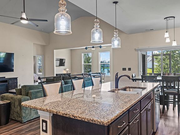 Open floor ranch planWaterfront lotCathedral vaulted ceilingsIrrigation systemScreened in porchDesk areaDining room