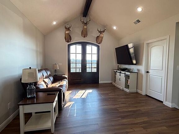 Sliding barn style doorsLarge patio areaAbundant wildlifeElectronic gate entranceRelaxing walk in showerCustom white cabinetryPrivate road