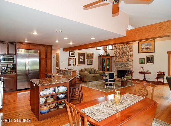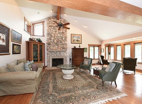 Located in the distinctive First Division neighborhood, enjoy the breathtaking views of Riverside's gorgeous riverscape from the expansive windows of this stunning 3 bedroom, 2.5 bath home. A total gut rehab in 2000, this contemporary house is move in ready! The open floor plan offers a great room with living/dining spaces, stone fireplace, vaulted ceilings and a gourmet kitchen including large island, granite counter tops, and stainless steel appliances. The first floor has a spacious master bedroom en suite. The unique enclosed wrap around porch has a 2nd fireplace, radiant floors and is the perfect place to relax and enjoy the beautiful natural surroundings. The second story loft offers additional recreational space or can be used as a 4th bedroom. Other features include a finished basement, 2 car garage, ample closets, and central air. This unique property is in walking distance to the Metra train station, award winning schools, and shopping.
