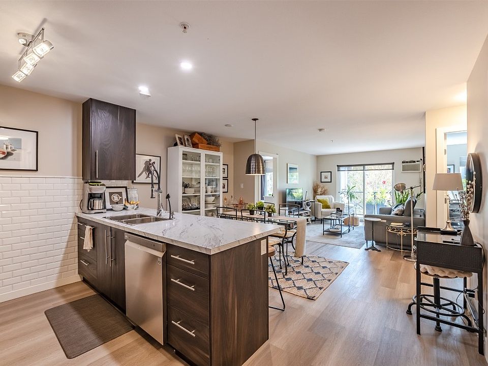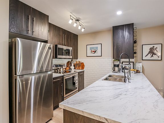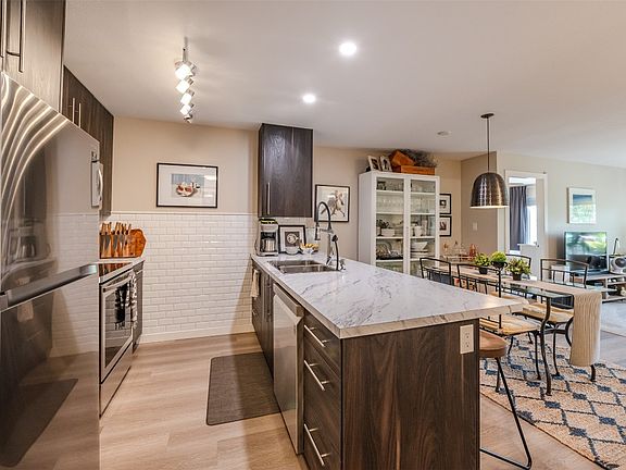 Beautiful and updated 2 Bedroom/2 Bath Condo in the heart of Penticton at The Ellis complex on Hastings Ave. Some of the improvements of this tastefully renovated condo are upgraded kitchen cabinets and countertops with an extended 9ft. peninsula Island that makes entertaining a breeze with a 10” overhang for up to 4 bar stools. There is an extensive use of white beveled subway tiles for a designer touch. The attractive open concept kitchen comes with quality stainless appliances including a stove with convection oven, dual zone fridge, high end DW and microwave with LED lighting throughout. The open concept dining area has room for a table and 6 chairs and a display cabinet. Quality vinyl plank flooring throughout and a custom Benjamin Moore paint color gives this unit a high-end look with a neutral palette for all your decorating choices. The Master Bedroom has a barn door that leads to an upgraded walk-through closet and ensuite with extensive upgrades such as the cabinet/countertop/backsplash. The front entrance has a sizeable closet with a 4’ x 8’ storage/pantry behind a 2nd barn door. This property boasts a beautiful, covered deck with upgraded vinyl flooring facing east to enjoy the morning sunrise and provides shade in the hot afternoon summers. Close to shopping, entertainment, restaurants, and only a few minute's drive to the beach. There is a secure heated parkade with one assigned stall and a 2nd underground stall included and prepaid for a year if closing is completed by Oct. 31st 2025. Strata fees are a low $382 per month and includes hot water. Pets allowed (2 cats). The Ellis at Kettle Valley has no age restrictions with rentals opportunities for the investor.