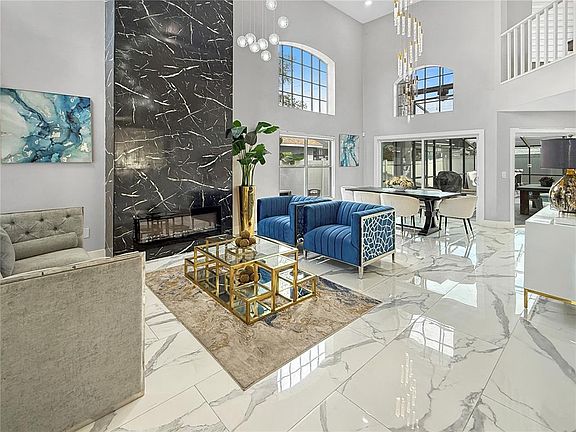 Welcome to this stunning 4-bedroom, 2.5-bathroom home that has been fully remodeled with modern finishes throughout. From the moment you step inside, you’ll be greeted by soaring ceilings, elegant marble-style flooring, and a spacious open-concept layout designed for both style and functionality. The gourmet kitchen is a chef’s dream, featuring a massive waterfall island, custom cabinetry, stainless steel appliances, double ovens, wine refrigerators, and designer lighting. The living areas are bright and inviting, highlighted by a dramatic floor-to-ceiling fireplace and oversized windows that fill the home with natural light. The primary bedroom is conveniently located on the first floor, offering privacy and ease of access, while the additional bedrooms upstairs include themed rooms perfect for family or guests. The bathrooms boast spa-like designs with a freestanding tub, rainfall shower, and sleek modern finishes. This home offers a low and flexible HOA with no CDD, giving you more freedom and affordability. Perfectly located in a desirable community, it provides easy access to shopping, dining, major highways, and Central Florida’s world-famous attractions. With its blend of elegance, comfort, and modern upgrades, this home is truly move-in ready and waiting for its new owner!