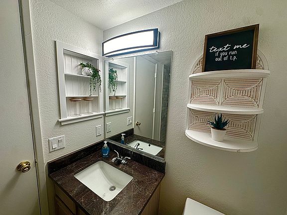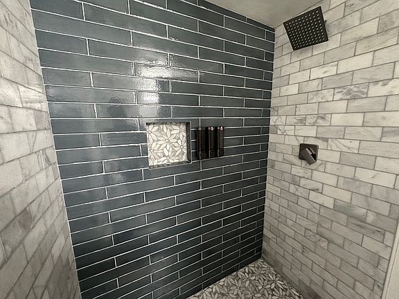 Modern updatesCozy couch and tvTasteful lightingTiled bathroom showerComfortable bedIncluded table