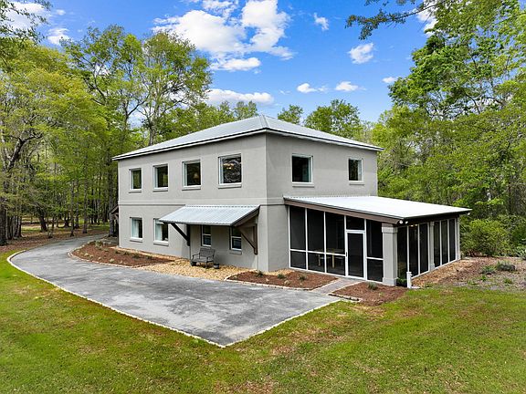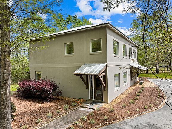 This contemporary country home with 40 beautiful acres was designed and built by world renowned artist Suzanne Leloup-West. Suzanne designed the house to be artistically beautiful and energy efficient. Thanks to 14 in. thick poured concrete outside walls and 6 inches of insulation, the average utility bill for this 3600 SF home is only 200.00 per mo. The first floor includes, an art studio w/ separate entrance, a media room with murphy bed, a computer room, 2 bedrooms w/ access to the adjoining screened in porch where you will find a summer kitchen, microwave, & custom sink. Adjoining the screened porch is a garden area with fountain and outdoor woodburning fireplace. The 2nd floor has natural heart pine flooring throughout, an oversized kitchen/dining area library & master suite. You will love the panoramic views from the 2nd floor thanks to the custom-built 5'x6' windows. The property also includes a detached two car garage, a 12x15 equipment building, a 15x20 garden house with water, electricity & temperature-controlled fan system. The 40 acres is a mixture of hardwoods, a few pines, wild azaleas, and pasture. Trails have been built throughout the property so you can move in and immediately start enjoying your private country paradise
